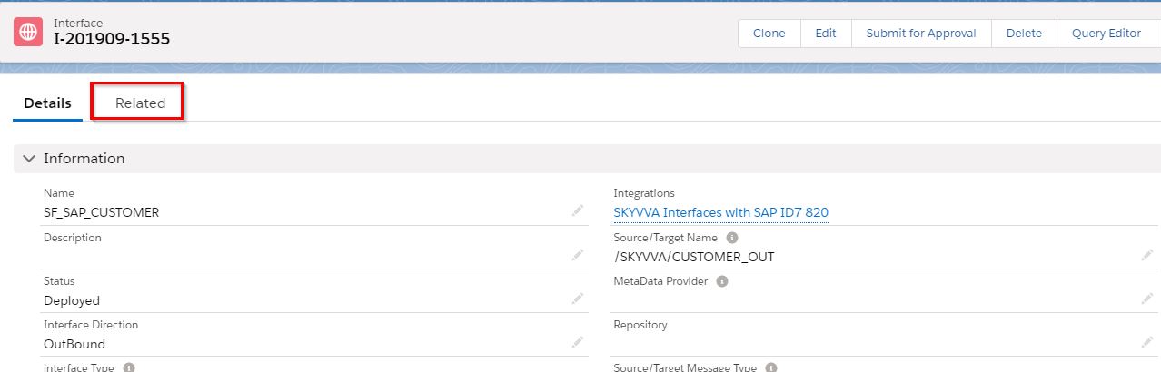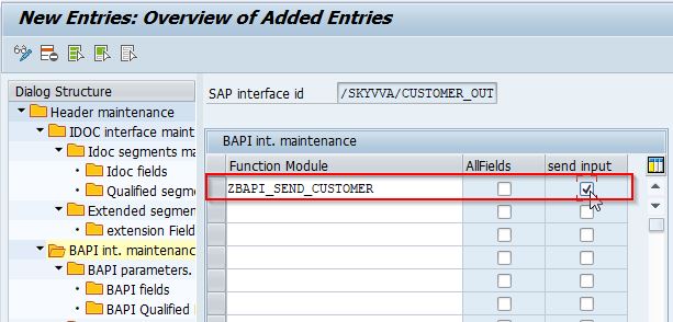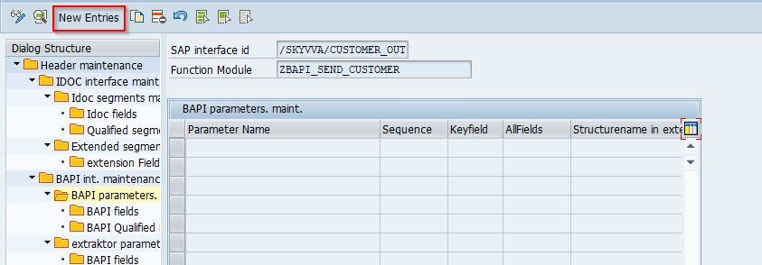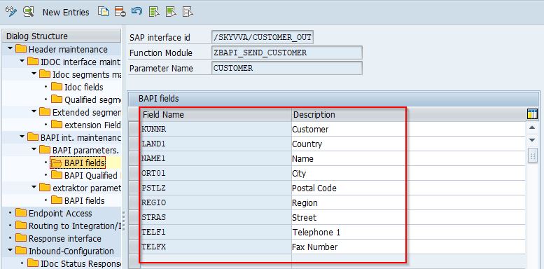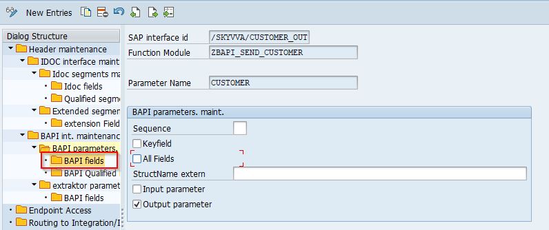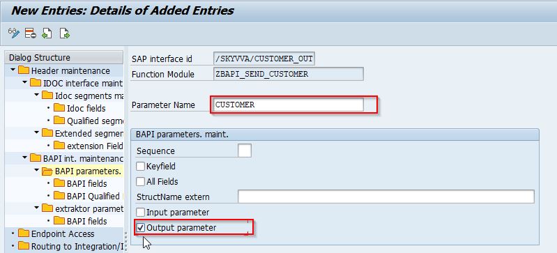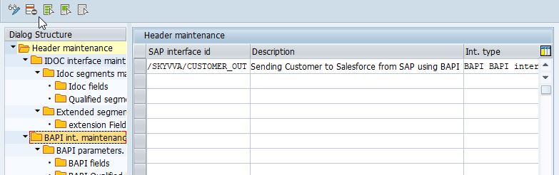 After this step, you have created an interface with the name /SKYVVA/CUSTOMER_OUT. Now you need to specify the parameter and fields you want to transfer to Salesforce.