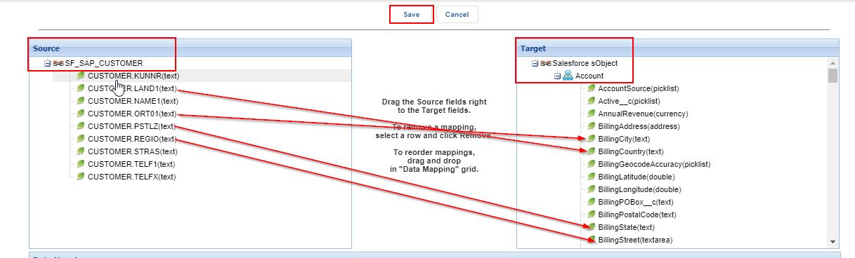 After the upload is successful you will see the result like the screen below, after refreshing the page. You will get the fields you have selected from SAP. Now you can do the mapping from the SAP fields on the left-hand side to the field of Salesforce object e.g. Account on the right-hand side. How to do a mapping refers to the mapping guide.