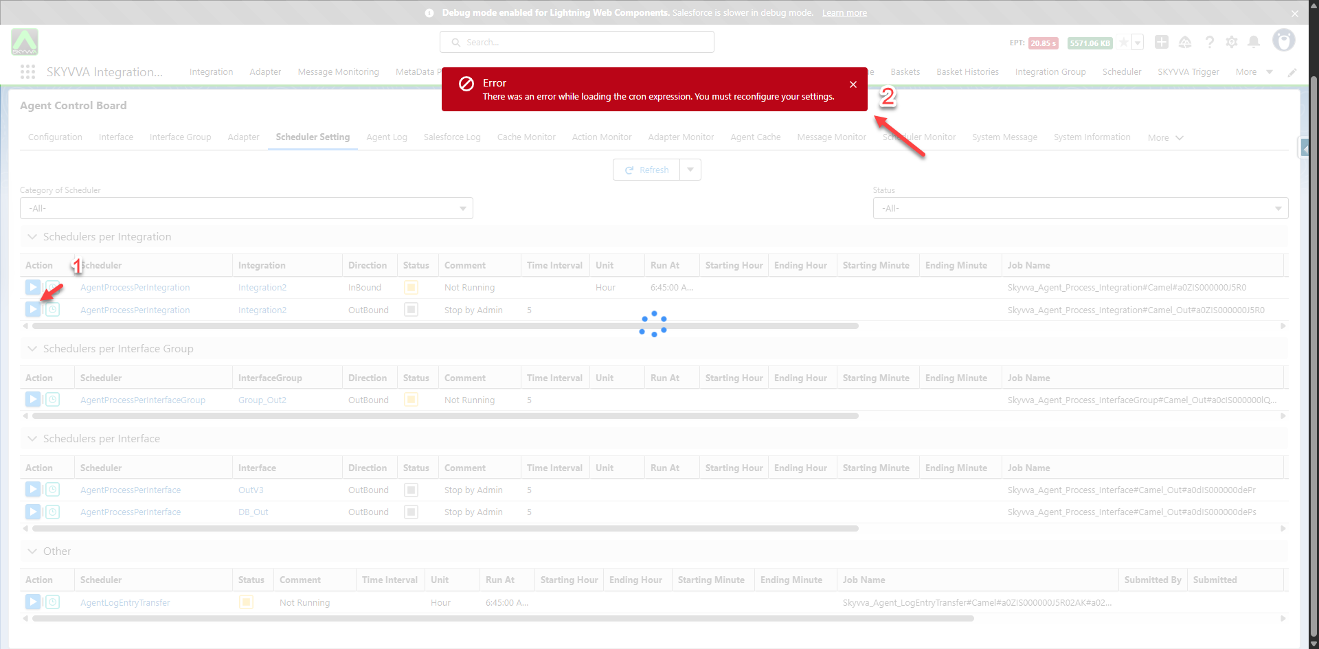 If you did not stop the outbound scheduler processing before the upgrade, the Outbound Processing is still using the old method that consumes significant event resources. Errors like ‘Agent Response: The Scheduler with id: xxxxxxxxxxxxxxx is not running.’ are appearing in the comments of the Outbound Scheduler, but the processing remains functional on the Salesforce side. This indicates that the processing is not running for the Agent side.