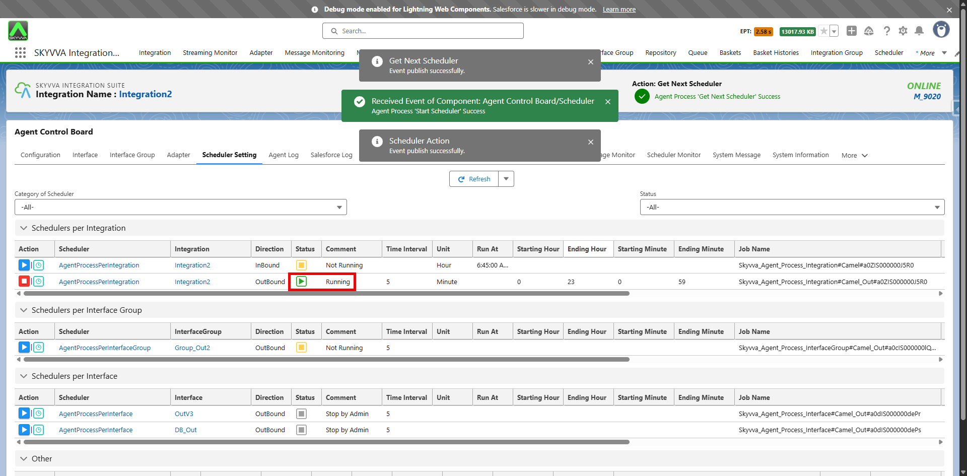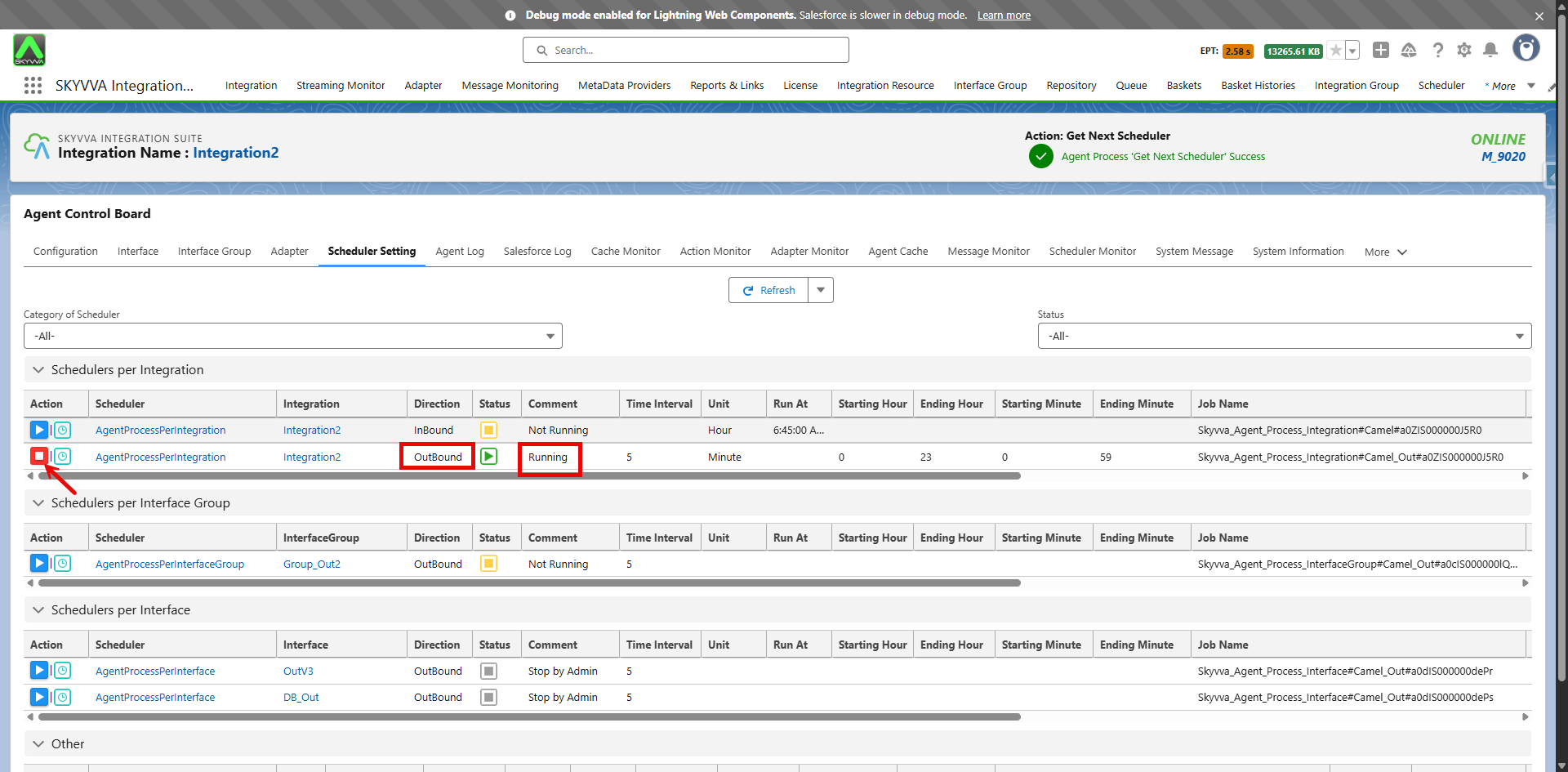 - Finally, the AgentProcessPerIntegration scheduler is now running. Please make sure to reconfigure all the outbound schedulers that you intend to run after the upgrade.