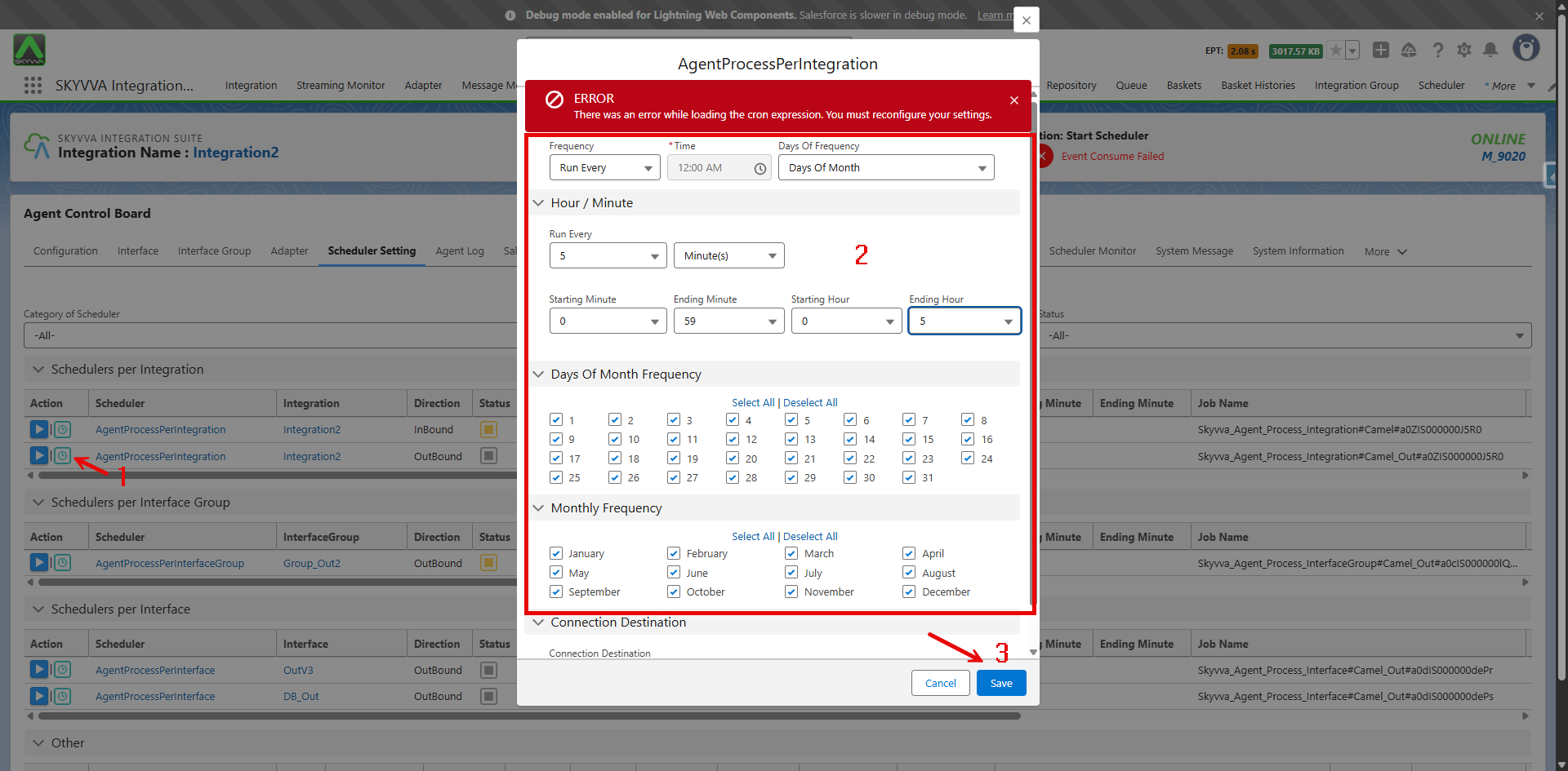 In light of our enhancements in outbound processing on the Agent side aimed at minimizing event usage, it is crucial to halt all outbound schedulers before upgrading Skyvva (from version 2.51.7 or earlier to 2.51.8 or later) and the Agent Version (from 3.05.7 or earlier to 3.06.03 or later) in non-open firewall mode exclusively.