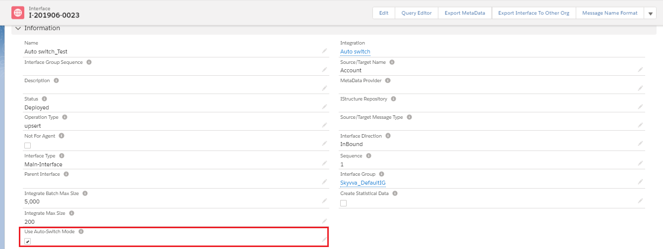 We click on the ‘Account Interface’ link and see the Interface Details and scroll down to Runtime Configuration-Inbound section then checkbox on Use Auto-Switch Mode.